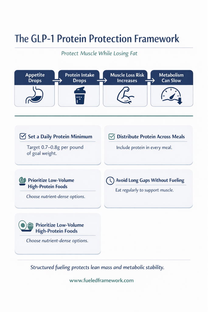 The Fueled Framework is a structured metabolic nutrition system designed to support muscle preservation, energy balance, and sustainable weight management. While this guide focuses on GLP-1 medications, the framework itself applies to a much broader approach to metabolic health.